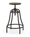 Taburete Industrial con estructura de acero y asiento de madera regulable en altura.